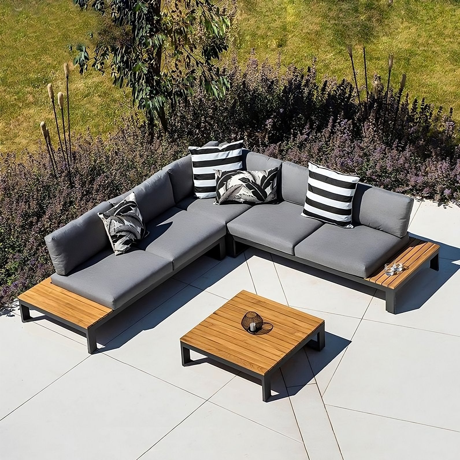 This elegant outdoor sofa set features a sophisticated contemporary design, perfect for complementing any outdoor living space. With its sleek and modern style, this sectional provides both comfort and style. Create the ultimate outdoor oasis with the Alfresco Outdoor Sectional L shape Sofa Set.