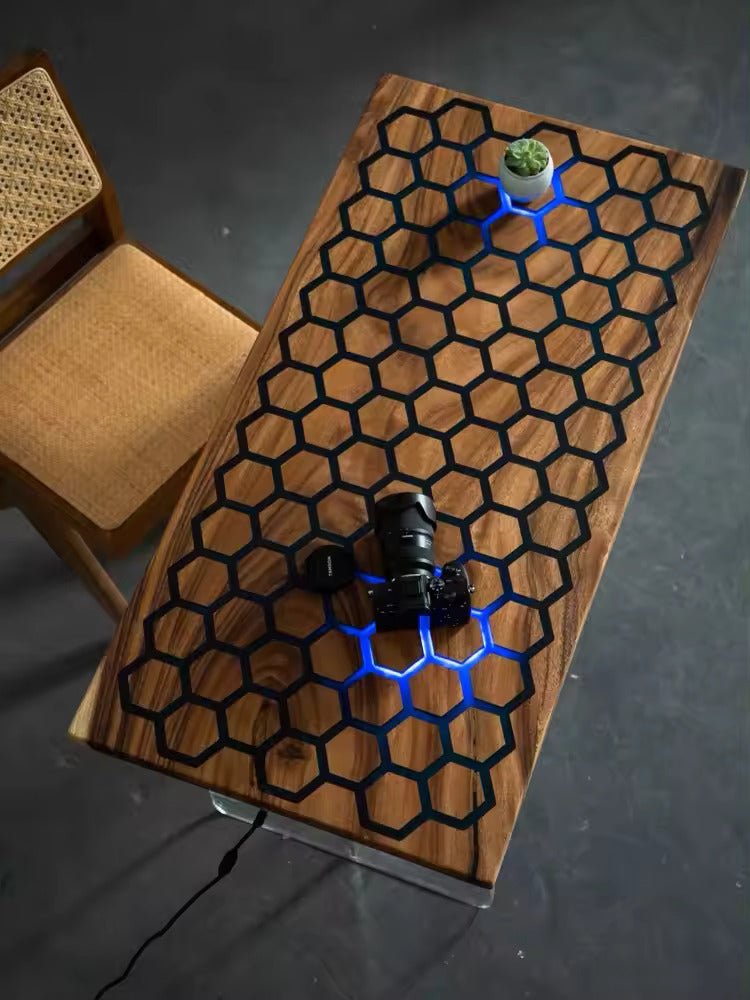 Elevate your living space with our Hand Crafted BEEHIVE Epoxy LED Intelligent Coffee Table. Crafted with touch sensitive LED lights, solid wood, and a sophisticated epoxy design, this table brings both style and functionality to your home. Enjoy the convenience of a built-in light source and the elegance of a unique piece of furniture.