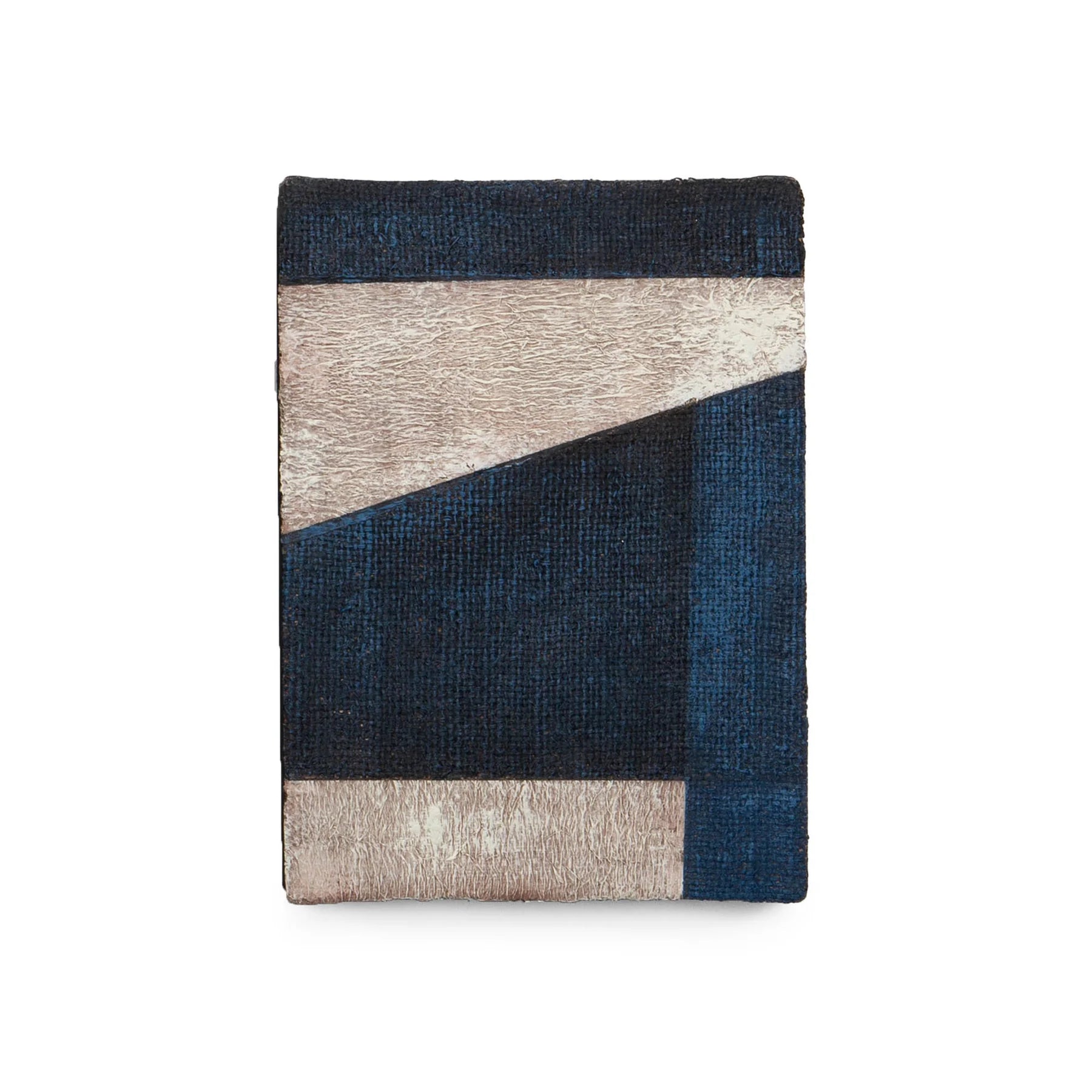 Inspired by nature, this eye-catching piece of artwork is composed from with individually selected pieces of old rice bags, attached together with reused jute fabric. Stretched over a black painted hardwood boxframe it is finished with waterbased paint to give it a distinctive geometric design.