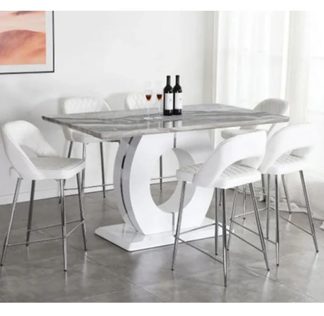 This dining table has a marble top which is white and grey in shade. It also has a circular design on its base, which has a silver lining on it that makes it look ravishing. The chairs are of white color with stainless steel legs.It is a durable product.