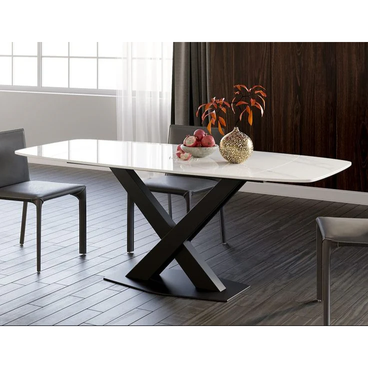 The contrast between the white and grey tabletop and the black metal base is visually striking.